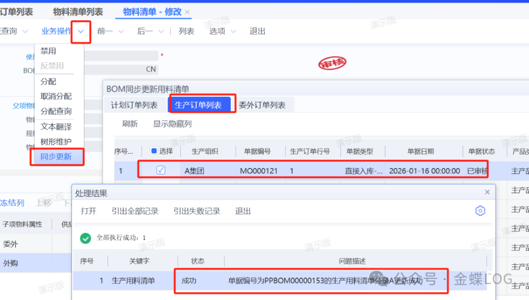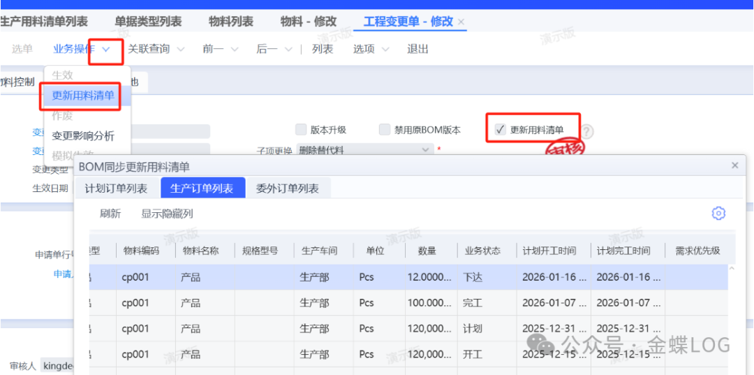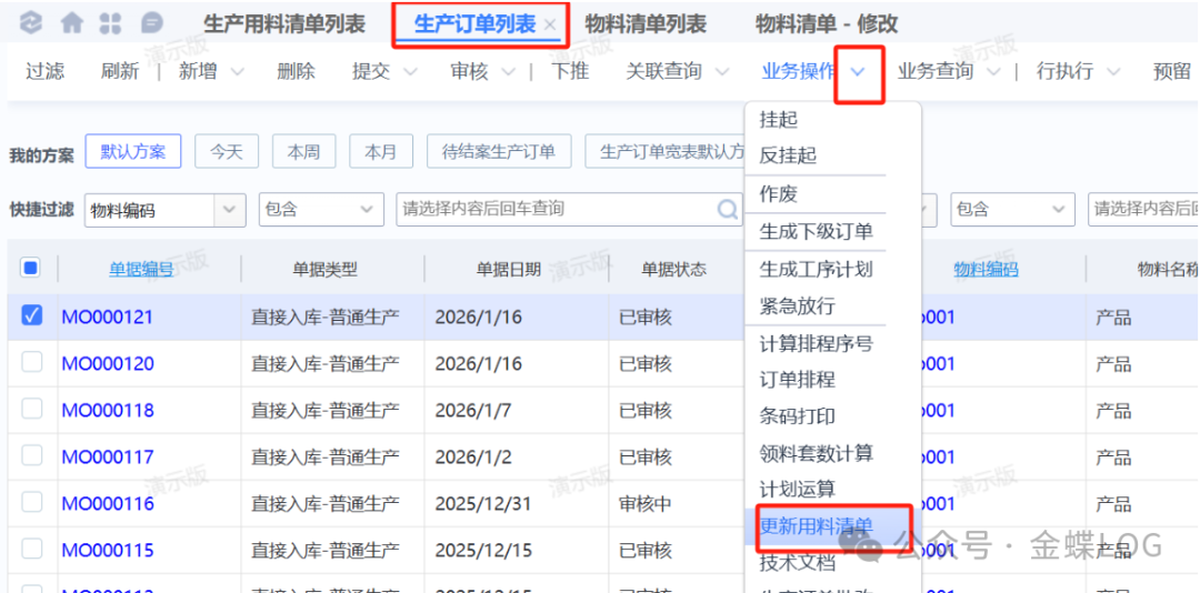 【生产订单列表】-【业务操作】按钮里面,也有一个【更新用料清单】按钮,跟上面讲的【物料清单】同步按钮功能是一样的,只是操作界面不一样;因为有些公司在工程改完BOM之后,会通知PMC重新下单更新一下投料,那么通过这个按钮,PMC可以不删工单情况下将工程修改内容同步到工单,当然前提工单的业务状态要是【计划】或【计划确认】