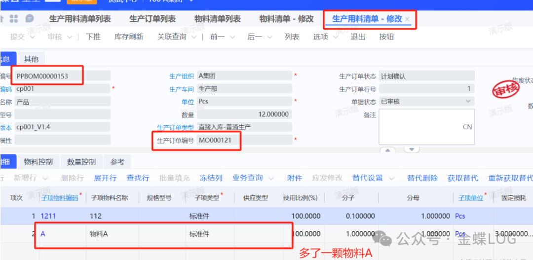 在没启用的情况下,如果中途有增删改物料,PMC可以直接反审核【生产用料清单】进行修改。