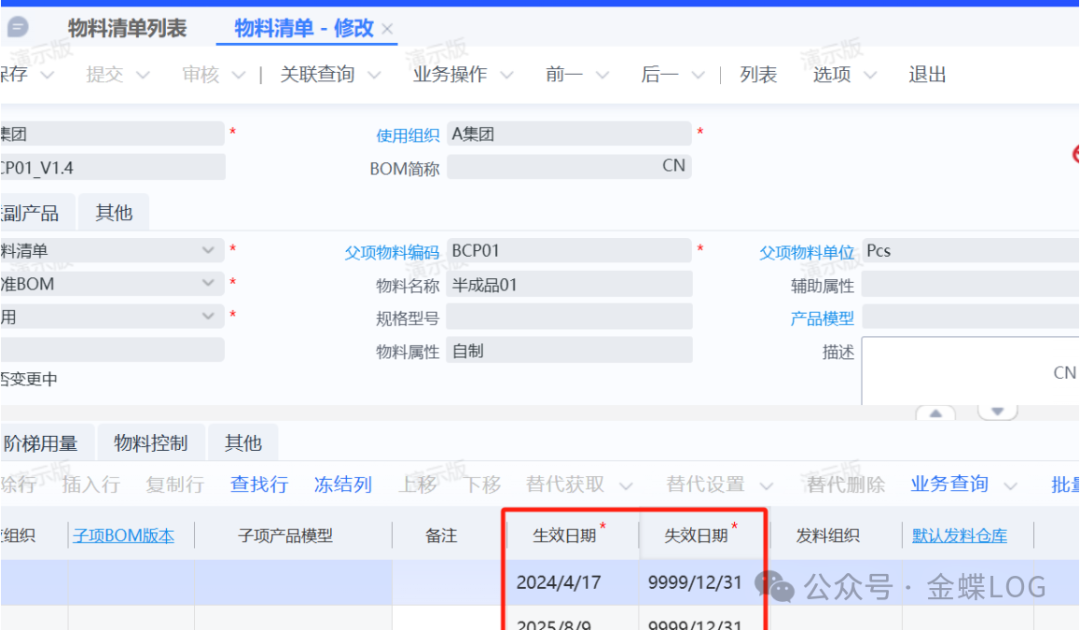 这里在修改【物料清单】的时候,要留意一下【生效日期】和【失效日期】字段,工单的日期要在此范围内,不在的话会同步失败(当然失败还有其他的原因)