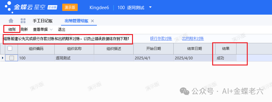![]() 七、出纳结账最终分析合理对账差异之后,我们是可以允许合理业务的差异的,如果能完全对平,那也说明是完全按照金蝶的系统规范去进行出纳业务处理,这样是最好的,这样我们就可以进行出纳结账了!出纳结账如下图所示,还是比较简单的。