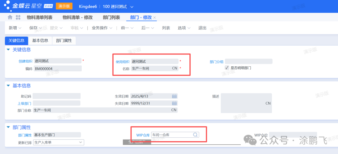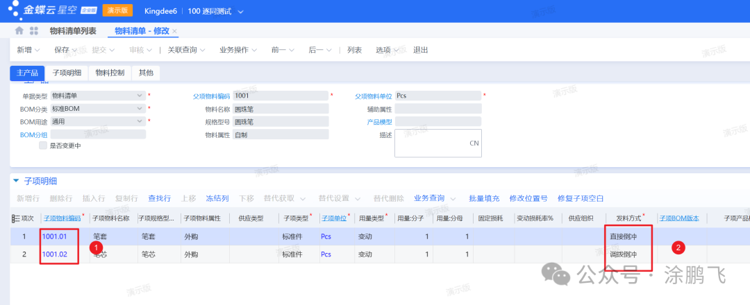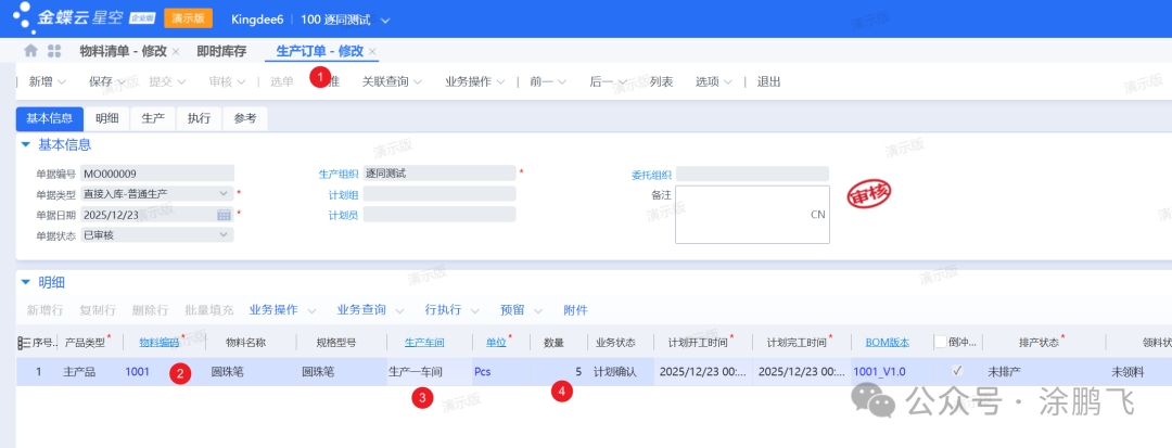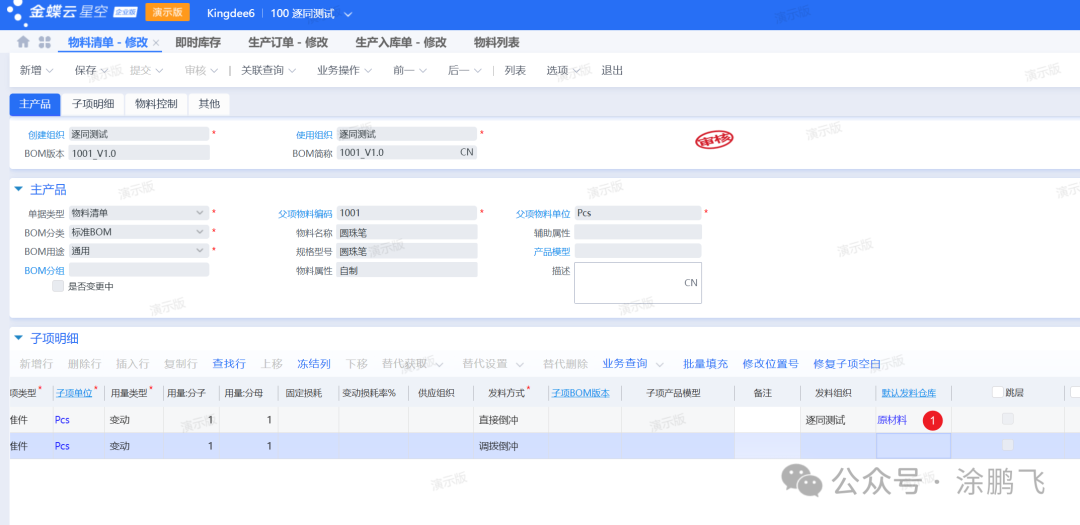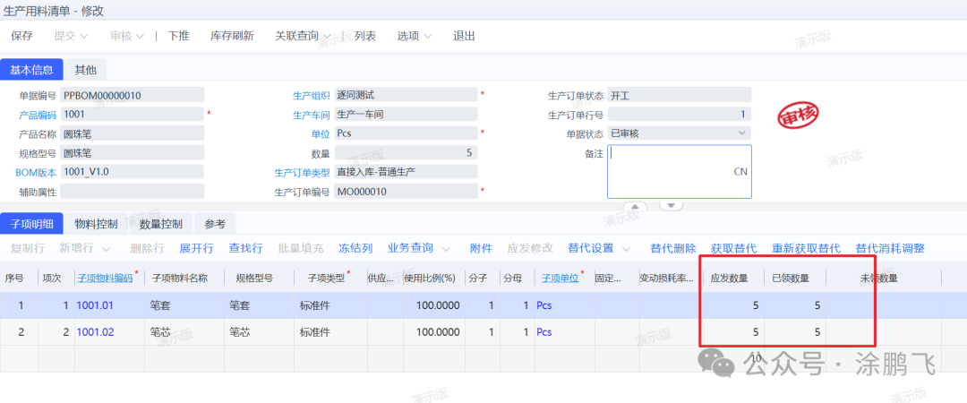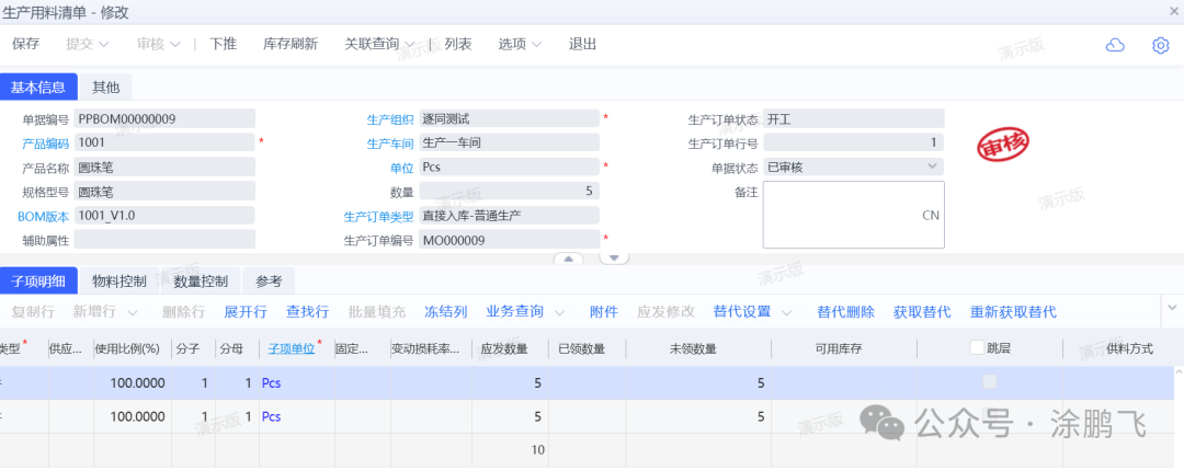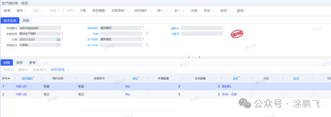 我们再去查看当前生产订单的生产领料单和生产用料清单是否符合我们的预期,生产领料单如预期所示,1001.01从原材料直接发料,1001.02从车间仓直接发料,如下图。