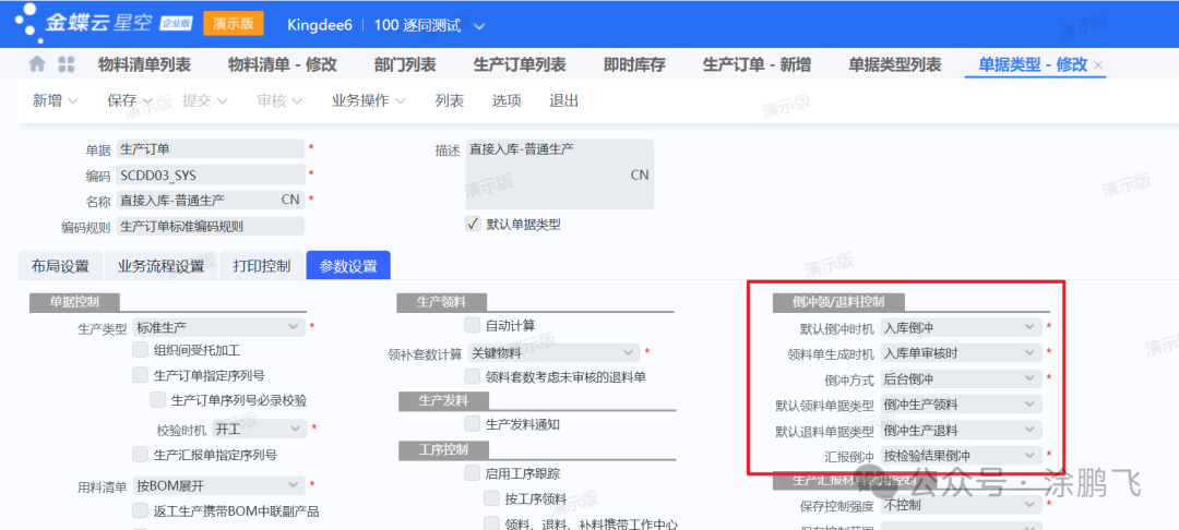 首先我们需要在BOM上设置好物料的发料方式、设置车间仓库、单据类型参数等。。
