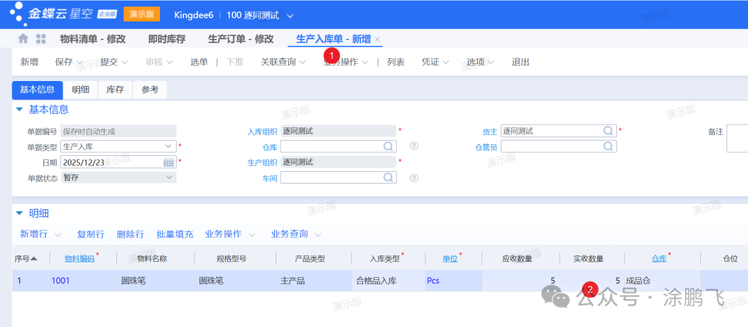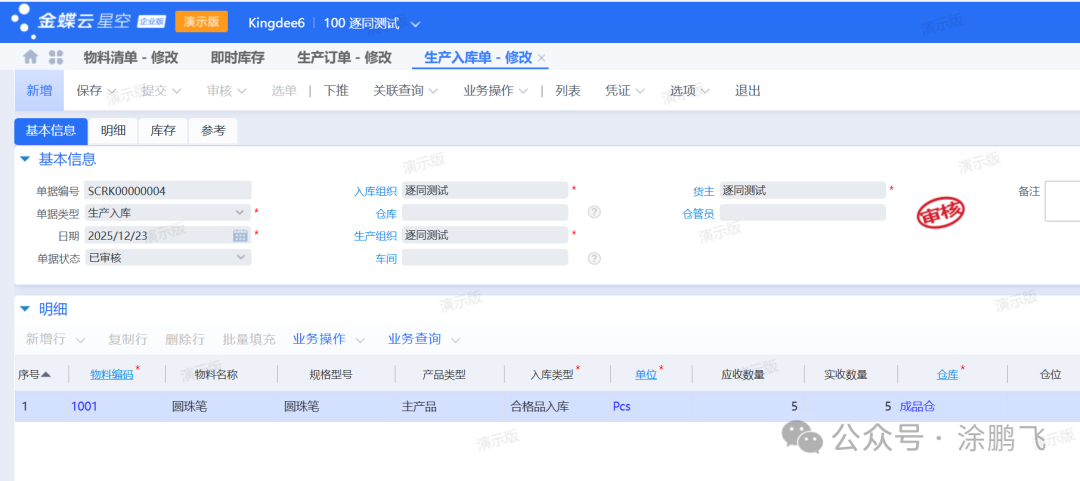 同时要记得查看生产用料清单是否审核、生产订单下达等,才能进行生产入库。