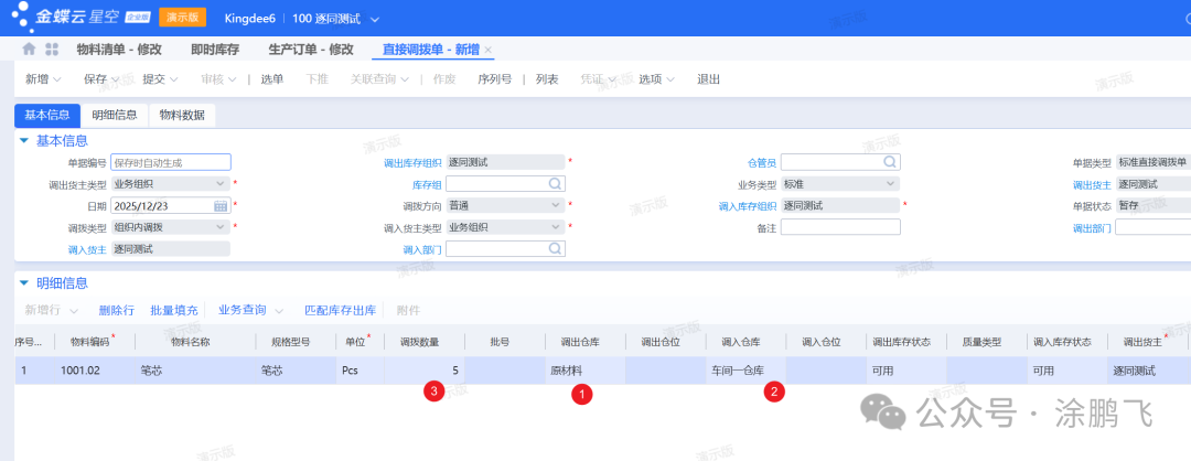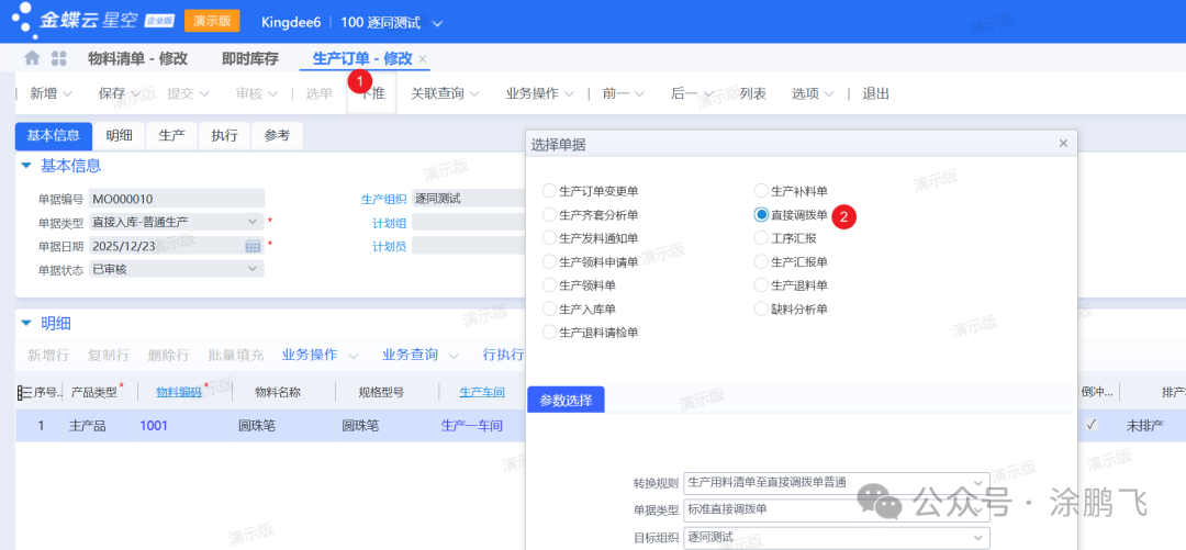 如下图所示,我们再重新新建一个生产订单,我们先推直接调拨单,调拨1001.02物料到车间仓库。