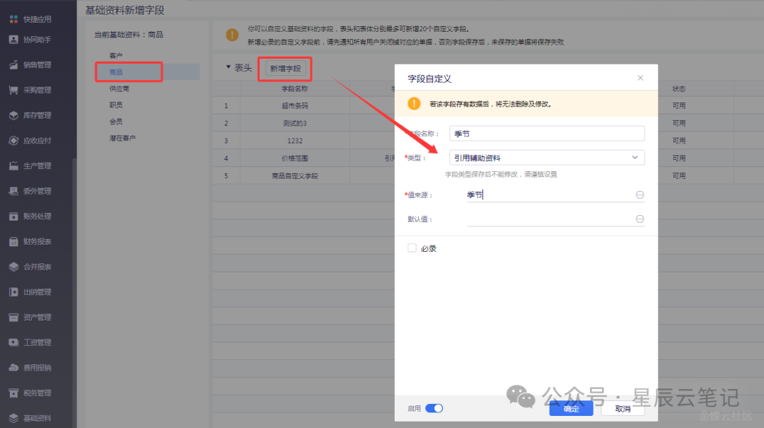 7、为什么自定义字段选择“引用辅助资料”后,“值来源”里没有可选项?它的作用是什么? 【解决方案】 “引用辅助资料”里的“值来源”是引用的《辅助资料》里由用户手工添加的分类,不包括系统内置的分类。 “引用辅助资料”用于处理需要下拉选择某些指定项目的场景,在实际应用中,用户可根据需要来设置。 比如服装行业一般会区分商品的季节,若要在商品中展现 (1)需要先在辅助资料中,新增“季节”的分类,然后在这个类别下面,建立具体的项目,如春季、夏季、秋季、冬季。