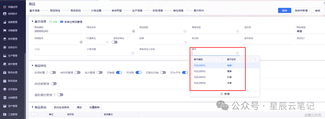 (3) 在新增商品资料时,就可以看到季节这个信息,并可下拉选择相应的季节了。