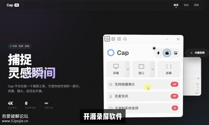 [点晴永久免费OA][Windows] 放大录屏 Cap v0.4.0中文版是一款开源的屏幕录制和分享工具