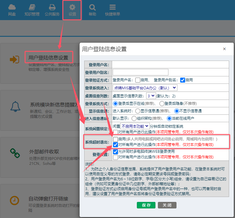 1、关闭用户超时无操作判断,用户本人或管理员登录点晴MIS系统-》设置-》用户登陆信息设置