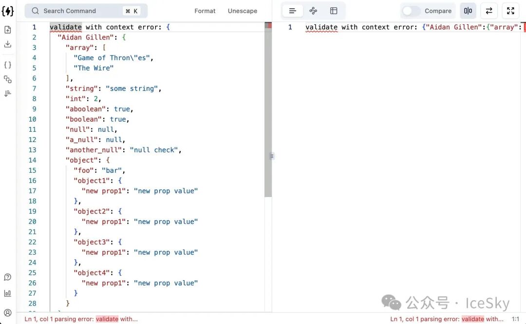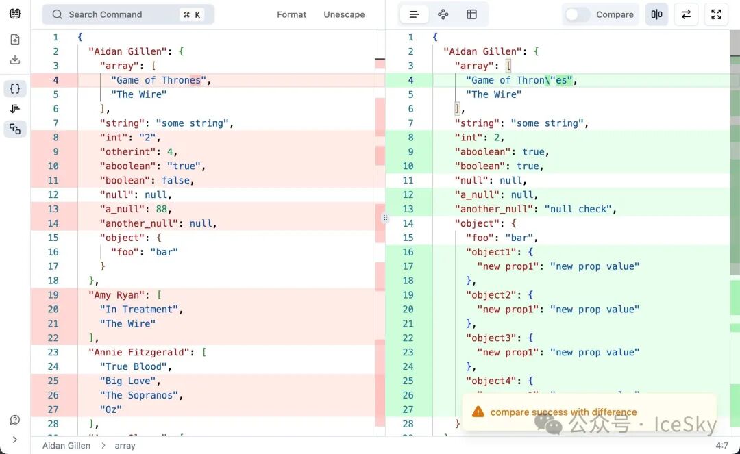 • 文本比较:支持将无效 JSON 降级为文本比较(text diff),体验与 git diff 接近。