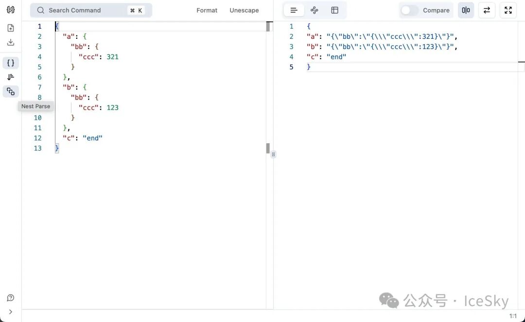 • JSON 反转义:对 JSON 数据进行反转义,删除 \ 字符使其成为合法的 JSON。