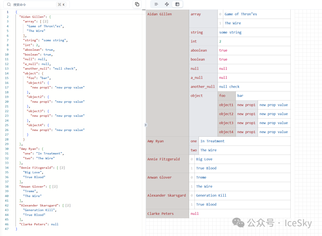 可视化:支持图形与表格视图,用节点图或表格形式展示JSON结构,可通过JSON Path快速定位。
