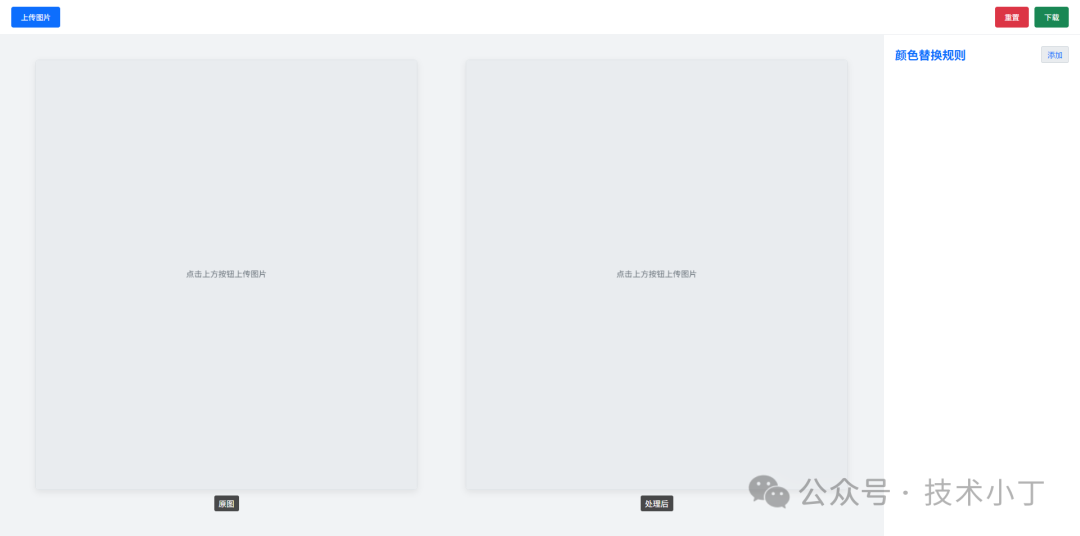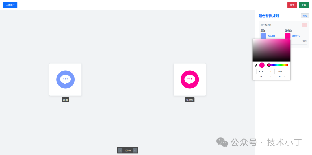 这个图片换色工具具有直观的用户界面和流畅的交互体验。用户首先通过“上传图片”按钮导入待处理的图像,随后可以在左侧原图区域点击任意位置来选取颜色作为源颜色,系统会自动生成一个新的颜色替换规则。在右侧的控制面板中,用户可以添加多个颜色替换规则,每个规则都包含源颜色、目标颜色以及颜色容差设置。当用户调整颜色值或容差参数时,处理后的图像会实时显示在右侧画布上,与原始图像形成对比。用户还可以通过缩放控件放大缩小图像查看细节,并最终下载处理后的图片。