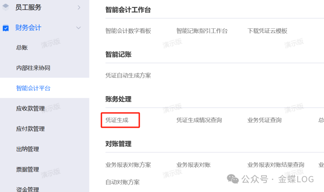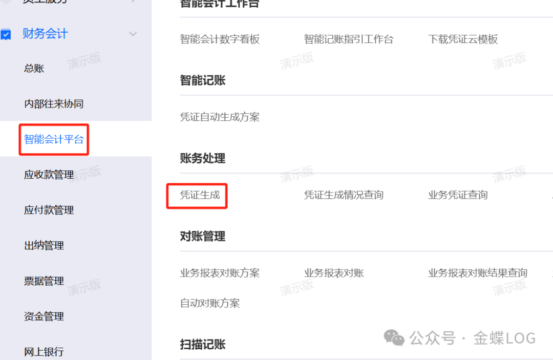 有业务单据,在【单据列表】、【各业务模块】和【智能会计平台】都有【凭证生成】的功能这里首选方式是【智能会计平台】,因为所有模块的单据在这里都会显示。