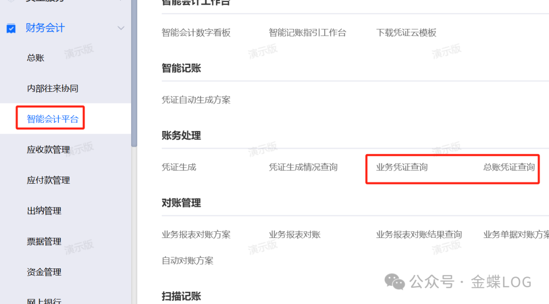 ①单据列表按钮查询、②各模块的凭证生成查询、③智能会计平台的凭证查询、④总账模块的凭证查询,推荐使用【总账模块】或【智能会计平台】的功能,因为可以查出所有的凭证数据。