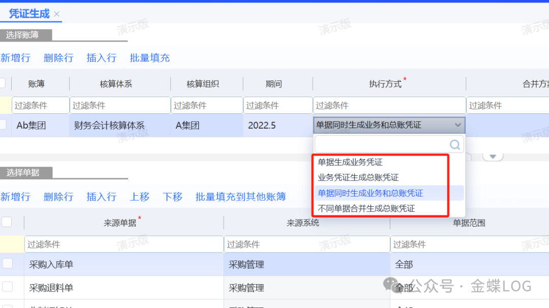 单据列表里有一些单据配置了【生成凭证的按钮,此时则可以在列表勾选对应单据生成凭证;