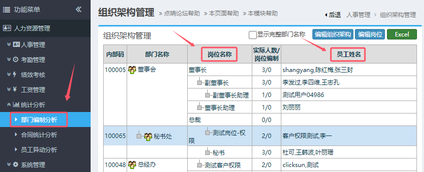 就会看到各个岗位上的人员情况了,点击右上角“Excel”按钮,就可以将组织架构导出到Excel文件。