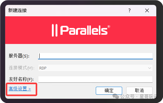 1.打开Parallels RDP Client后,按下快捷键Ctrl + N新建会话,默认是Parallels自身的协议,我们可以选择“改为RDP连接”