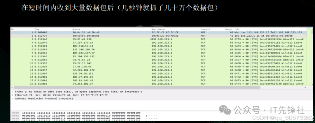 介绍关键技术点1:SYN泛洪攻击SYN泛洪攻击是一种常见的分布式拒绝服务(DDoS)攻击方式,攻击者通过向目标服务器发送大量的SYN请求报文,但不完成三次握手的后续步骤,从而耗尽服务器的连接资源。这种攻击的特点是发送大量无应答的SYN包,导致服务器无法处理正常的连接请求。使用Wireshark抓包工具,可以实时监测网络...