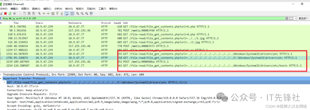 介绍关键技术点1:文件读取漏洞流量特征在分析文件读取漏洞流量时,一个关键的技术点是识别特定的文件访问模式。攻击者通常尝试读取敏感文件,如配置文件、密码文件或数据库备份。这些请求往往通过标准的应用层协议发起,如HTTP、FTP或SMB。在Wireshark中,可以通过过滤这些协议并查找包含特定文件路径或命令的HTTPG...