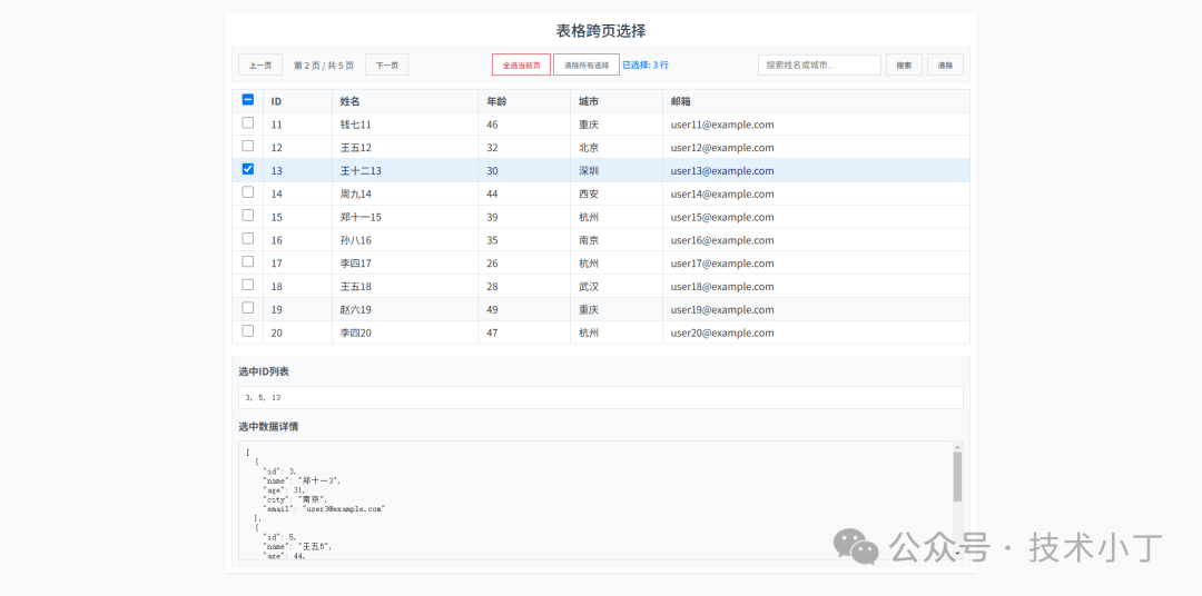 在数据展示与管理的场景中,用户往往需要从大量数据中进行跨页选择操作。传统的表格选择功能通常局限于单页,当用户需要对多页数据进行批量操作时,往往需要重复选择,效率低下。本文实现的表格跨页选择功能,能够记住用户在不同页面的选择状态,支持全选、清除、搜索等操作,极大提升了数据操作的便利性。本文将介绍如何使用HTML、CSS和...