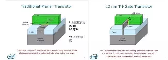 三星以及台积电在先进半导体制程打得相当火热,彼此都想要在晶圆代工中抢得先机以争取订单,几乎成了 14 纳米与 16 纳米之争,然而 14 纳米与 16 纳米这两个数字的究竟意义为何,指的又是哪个部位?而在缩小制程后又将来带来什么好处与难题?以下我们将就纳米制程做简单的说明。 纳米到底有多细微? 在开始之前,要先了解纳米究竟是什么意思。在数学上,纳米是 0.000000001 公尺,但这是个相当差的例子,毕竟我们只看得到小数点后有很多个零,却没有实际的感觉。如果以指甲厚度做比较的话,或许会比较明显。 用尺规实际测量的话可以得知指甲的厚度约为 0.0001 公尺(0.1 毫米),也就是说试着把一片指甲的侧面切成 10 万条线,每条线就约等同于 1 纳米,由此可略为想像得到 1 纳米是何等的微小了。 知道纳米有多小之后,还要理解缩小制程的用意,缩小电晶体的最主要目的,就是可以在更小的芯片中塞入更多的电晶体,让芯片不会因技术提升而变得更大;其次,可以增加处理器的运算效率;再者,减少体积也可以降低耗电量;最后,芯片体积缩小后,更容易塞入行动装置中,满足未来轻薄化的需求。 再回来探究纳米制程是什么,以 14 纳米为例,其制程是指在芯片中,线最小可以做到 14 纳米的尺寸,下图为传统电晶体的长相,以此作为例子。缩小电晶体的最主要目的就是为了要减少耗电量,然而要缩小哪个部分才能达到这个目的?左下图中的 L 就是我们期望缩小的部分。藉由缩小闸极长度,电流可以用更短的路径从 Drain 端到 Source 端(有兴趣的话可以利用 Google 以 MOSFET 搜寻,会有更详细的解释)。 (Source:http://www.slideshare.net) 此外,电脑是以 0 和 1 作运算,要如何以电晶体满足这个目的呢?做法就是判断电晶体是否有电流流通。当在 Gate 端(绿色的方块)做电压供给,电流就会从 Drain 端到 Source 端,如果没有供给电压,电流就不会流动,这样就可以表示 1 和 0。(至于为什么要用 0 和 1 作判断,有兴趣的话可以去查布林代数,我们是使用这个方法作成电脑的) 尺寸缩小有其物理限制 不过,制程并不能无限制的缩小,当我们将电晶体缩小到 20 纳米左右时,就会遇到量子物理中的问题,让电晶体有漏电的现象,抵销缩小 L 时获得的效益。作为改善方式,就是导入 FinFET(Tri-Gate)这个概念,如右上图。在 Intel 以前所做的解释中,可以知道藉由导入这个技术,能减少因物理现象所导致的漏电现象。 (Source:http://www.slideshare.net) 更重要的是,藉由这个方法可以增加 Gate 端和下层的接触面积。在传统的做法中(左上图),接触面只有一个平面,但是采用 FinFET(Tri-Gate)这个技术后,接触面将变成立体,可以轻易的增加接触面积,这样就可以在保持一样的接触面积下让 Source-Drain 端变得更小,对缩小尺寸有相当大的帮助。 最后,则是为什么会有人说各大厂进入 10 纳米制程将面临相当严峻的挑战,主因是 1 颗原子的大小大约为 0.1 纳米,在 10 纳米的情况下,一条线只有不到 100 颗原子,在制作上相当困难,而且只要有一个原子的缺陷,像是在制作过程中有原子掉出或是有杂质,就会产生不知名的现象,影响产品的良率。 如果无法想像这个难度,可以做个小实验。在桌上用 100 个小珠子排成一个 10×10 的正方形,并且剪裁一张纸盖在珠子上,接着用小刷子把旁边的的珠子刷掉,最后使他形成一个 10×5 的长方形。这样就可以知道各大厂所面临到的困境,以及达成这个目标究竟是多么艰巨。 随着三星以及台积电在近期将完成 14 纳米、16 纳米 FinFET 的量产,两者都想争夺 Apple 下一代的 iPhone 芯片代工,我们将看到相当精彩的商业竞争,同时也将获得更加省电、轻薄的手机,要感谢摩尔定律所带来的好处呢。