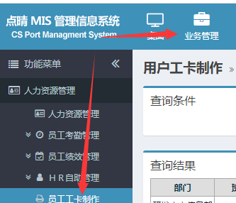 点击顶部业务管理,人力资源管理菜单中选择“员工工卡制作”;