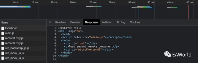 localhost 加载index.htmlmain.js 是Module Federation的核心的编排代码,负责加载远程组件。remoteEntry.js 是Module Federation暴露的远程组件的代码src_ 是打包后的代码,其中 bootstrap_js是容器侧的代码,index_js是微前端侧的代码。