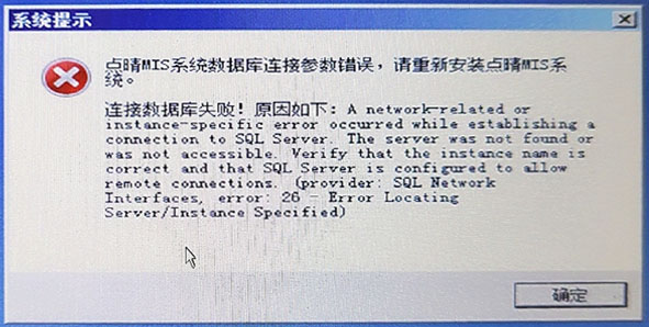 :点晴MIS系统数据库连接参数错误,请重新安装,出现“无法连接服务器-与网络有关或与实例有关的错误”?
