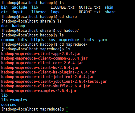 现在我们可以执行例子来感受下 Hadoop 的运行。Hadoop 附带了丰富的例子(运行 ./bin/hadoop jar ./share/hadoop/mapreduce/hadoop-mapreduce-examples-2.6.4.jar 可以看到所有例子),包括 wordcount、terasort、join、grep 等。