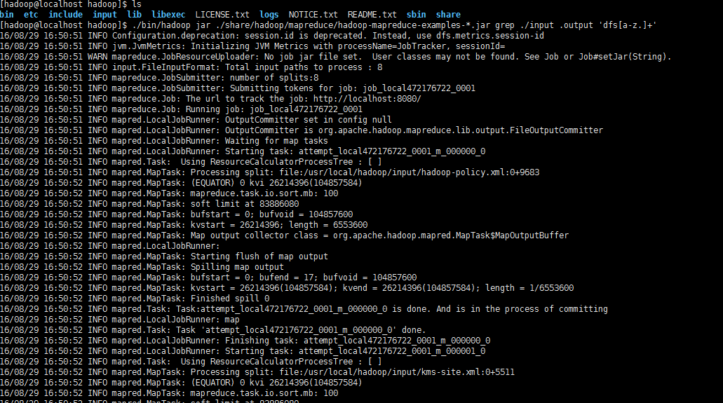 ./bin/hadoop jar ./share/hadoop/mapreduce/hadoop-mapreduce-examples-*.jar grep ./input ./output 'dfs[a-z.]+'