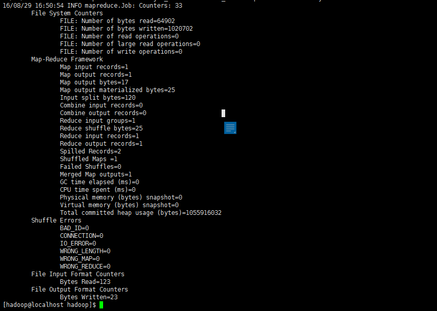 注意,Hadoop 默认不会覆盖结果文件,因此再次运行上面实例会提示出错,需要先将 ./output 删除。