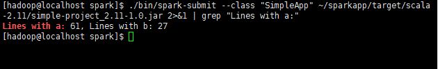 .bin/spark-submit --class "SimpleApp" ~/sparkapp/target/scala-2.11/simple-project_2.11-1.0.jar 2>&1 | grep "Lines with a:"