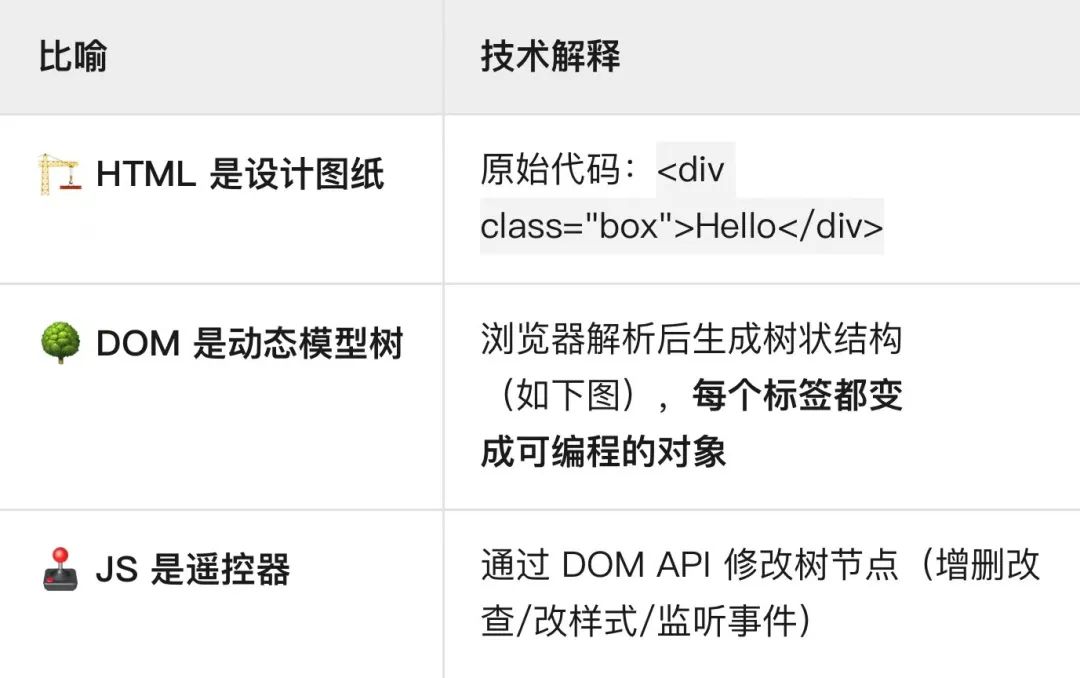 DOM的真实应用场景 1.购物车动态更新 点击"加入购物车" → DOM修改右上角数量显示 2.表单即时验证 输入密码时 → DOM实时显示强度提示 3.单页应用跳转 点击导航菜单 → DOM替换内容区,无需刷新页面 4.动态加载内容 滚动到页面底部 → DOM自动加载新内容 💡 一句话总结DOM是浏览器内存中的动态网页遥控器,JavaScript通过它让静态网页"活"起来,每个点击/滑动/输入都能触发实时变化。 阅读原文:原文链接 该文章在 2025/8/4 18:21:51 编辑过 |