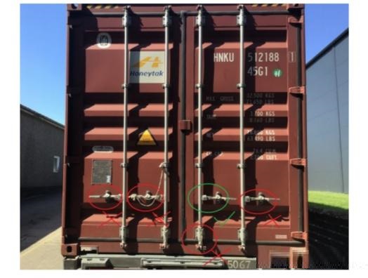 ![]() ——铅号清楚体现,如有多个铅封,多个铅封都需要拍照。 ——有海关封必须拍上 正确的施封位置 ![]() 如图所示,面对箱门,右侧箱门的左侧把手 注意:禁止将铅封封在其他位置。后左侧箱门打开并右侧箱门关闭照片 12.集装箱箱底照一张 ![]() ——提空柜时拍摄,需看到整个箱底状况 所有图片需注意: (1)照片中禁止出现人物; (2)货物及柜门必须拍完整,半幅照片视为无效。 如果采用点晴集装箱装柜拍照上传小程序(介绍网址:http://www.hgtp.cn),那么拍照完毕后就可以立即通过微信小程序上传到服务器,之后货主或承运商等相关人员可以立即在网上登录到点晴货柜图片管理平台查询到相应的集装箱装柜图片,支持直接图片下载、图片rar压缩打包下载、图片组按照指定格式生成PDF文件下载等,公共查询网址:http://hgcx.oa22.cn。