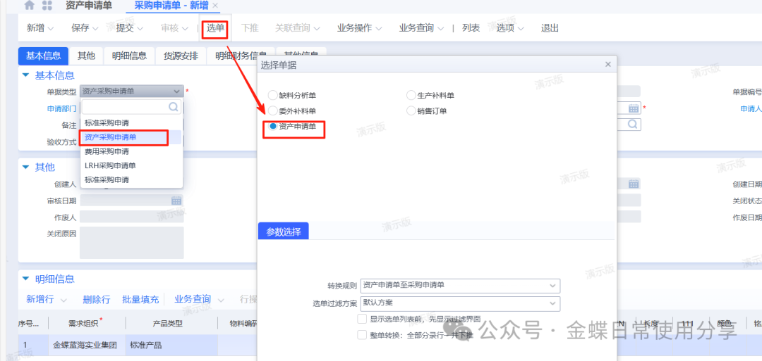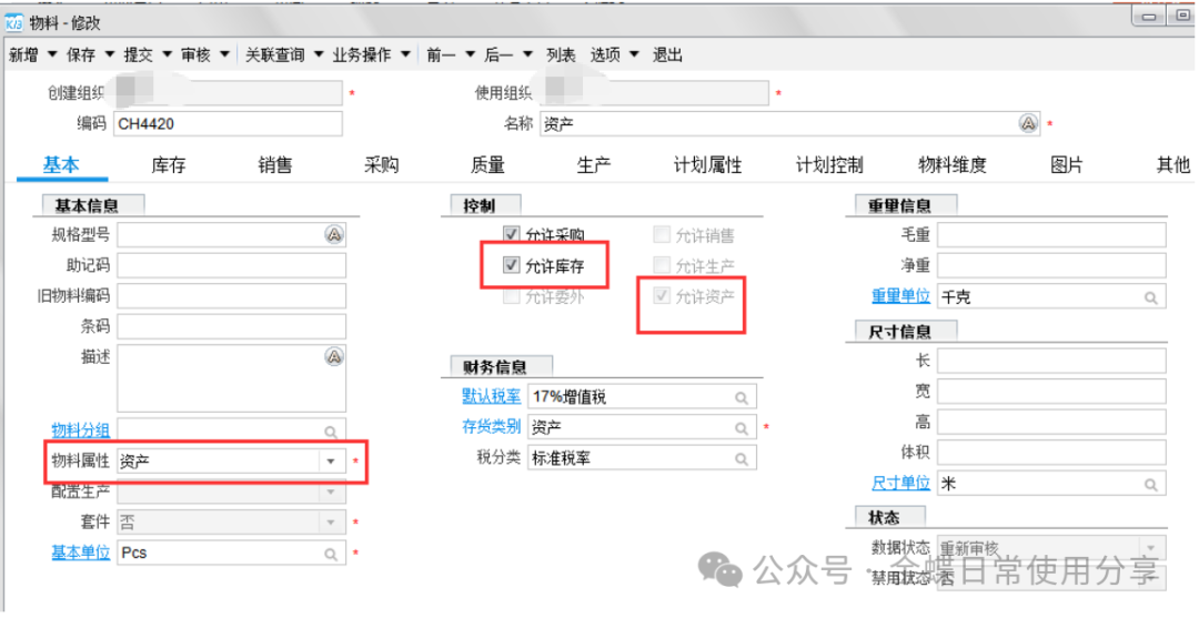 2业务数据2.1创建物料【业务场景】:企业用户资产物料的建立 【用户角色】:管理会计 【功能菜单】:【基础资料】->【主数据】->【物料】 【操作说明】:注:只有物料属性为资产的物料才能做资产申请单。 系统默认资产物料不入库,如果客户实际业务需要入库,那么在新建资产物料时一定要允许库存。 ![]() 2.2 资产申请单(可选)【业务场景】:企业用户新增资产提交申请 【用户角色】:企业用户 【功能菜单】:【资产管理】->【固定资产】->【资产请购】->【资产申请单】 【操作说明】:资产需求采购部门在系统中创建资产申请单,填写需求组织及部门、所需资产物料(物料属性为资产),数量及到货日期并提交审核。 ![]() 2.3采购申请单【业务场景】:企业用户新增资产提交采购申请单 【用户角色】:采购员 【功能菜单】:【采购管理】/【资产管理】->【采购申请-采购申请单】 【操作说明】:当需求人员做了资产申请单的情况下,首先调整采购申请单的单据类型为资产采购申请单,再通过选单的方式创建采购申请单,选择采购组织、录入推荐供应商(可选)提交审核。 ![]() 若需求人员不做资产申请单,可以直接创建采购申请单来达到申请的需要,单据类型为资产采购申请单,手动填写资产申请组织及部门、采购组织、物料、数量、到货日期、及建议供应商(可选)并提交审核。 ![]() 2.4 采购订单【业务场景】:企业用户新增采购订单 【用户角色】:采购员 【功能菜单】:【供应链】->【采购管理】->【采购申请】->【采购申请列表】->【下推采购订单】 【操作说明】:采购员填写单价并提交审核。 ![]() 2.5采购收料【业务场景】:企业用户进行采购收料操作 【用户角色】:采购员 【功能菜单】:【供应链】->【采购管理】->【订单处理】->【采购订单列表-下推操作】 【操作说明】:采购订单下推收料通知单,若实际业务需要入库且该资产物料设置了允许库存,则填写仓库,否则直接提交审核,没有入库动作的直接看2.8。 ![]() 2.6采购入库【业务场景】:企业用户进行采购入库操作 【用户角色】:采购员 【功能菜单】:【供应链】->【采购管理】->【收料处理-收料通知单列表】->【下推操作】 【操作说明】:提交审核 ![]() 2.7资产出库【业务场景】:企业用户需要资产出库 【用户角色】:仓储员 【功能菜单】:产品路径:【供应链】->【库存管理】 ->【杂收杂发】->【其他出库单】 【操作说明】:已入库的资产在领用时需要进行出库处理,新增其他出库单,更改单据类型为资产出库,填写领用部门、物料编码、实发数量、发出仓库等信息并提交审核。 ![]() 2.8资产卡片【业务场景】:企业用户需要新增资产,资产信息以卡片的形式记录 【用户角色】:管理会计 【功能菜单】:【资产管理】->【固定资产】->【日常管理】->【资产卡片】 【操作说明】:新增资产卡片,选择正确的资产组织及货主组织(资产组织和货主组织可以不相同即管理资产的组织与实际所有权所属的资产组织不一致,资产组织必须有资产职能,货主组织可以没有资产职能。),选择资产类型后再点击“选单”关联采购收料单或其他出库单。 ![]() 根据实际需求填写卡片,若一个使用组织使用多个会计政策,则需要在每种政策下,填写财务信息。 字段后有红点的为必录信息,录入后提交审核。 3固定资产日常管理3.1固定资产新增【业务场景】:企业用户需要新增固定资产 【用户角色】:管理会计 【功能菜单】:【资产管理】->【固定资产】->【日常管理】->【资产卡片】 【操作说明】:资产卡片为私有基础资料,按照实际使用组织进行创建 注:按变动进行折旧是不可逆操作,请根据自身情况加以选择。 选定好对应的会计政策,有多个会计政策的组织,每个会计政策下都要录入一遍财务信息。 开始使用日期为实物资产的实际使用日期,建议早于或等于资产的入账日期,该字段为文本字段不参与实物的财务计算,但会影响累计使用时间。 入账日期是固定资产启用期间中的一天 财务信息页签下,各字段所代表的内容及注意点。
