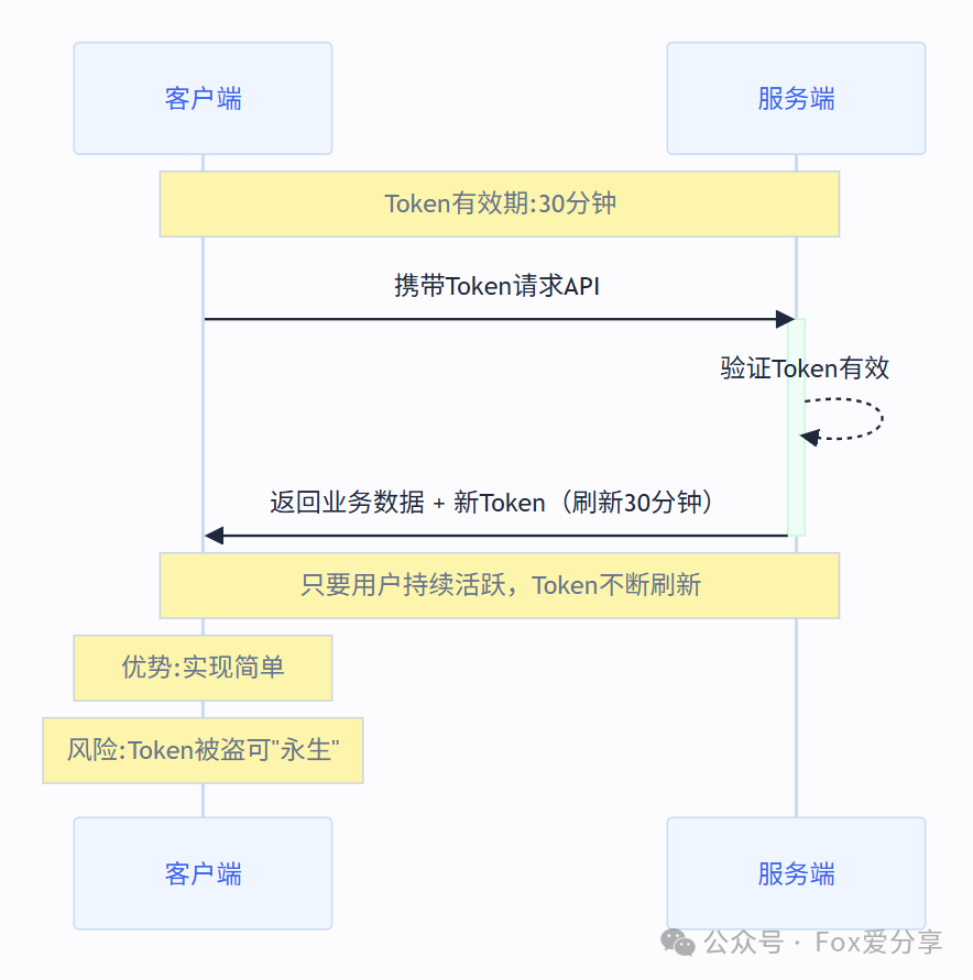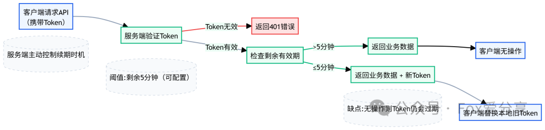 - 工作方式客户端正常请求,服务端在验证Token的同时,会检查其剩余有效期。如果发现有效期不足某个阈值(比如只剩5分钟了),就在这次请求的响应头里,主动塞一个新的Token给客户端。客户端需要检查响应头,如果发现有新Token,就替换掉本地的旧Token。