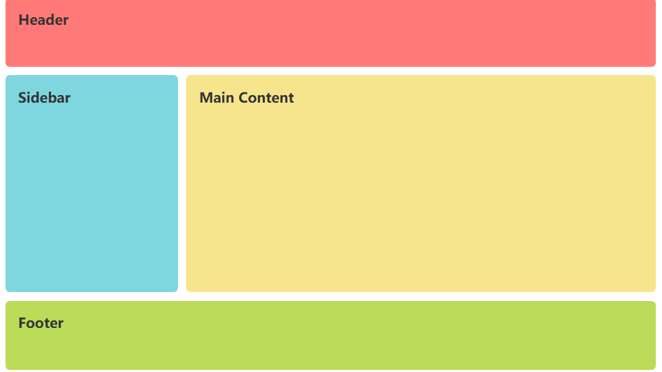 使用Grid轻松实现Header, Footer, Sidebar, Main Content区域,并添加简单的响应式。在桌面端,会看到经典的Header、左右布局、Footer结构。调整浏览器窗口宽度小于768px时,布局会自动变为单列堆叠,Sidebar移动到Main Content上方,非常适合移动设备浏览。
