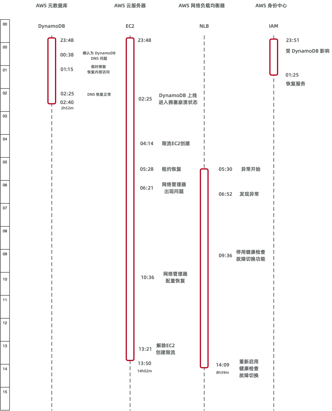 当然,DynamoDB,EC2,NLB 的故障其实还引发了许多服务的次生故障,比如 AWS 自己的工单支持系统,STS,IAM,Redshift,等等等等。这里特别提一下 IAM ,之前 Google IAM 带崩半个互联网,以及 阿里云全球全局服务大故障,都与身份认证这项基础服务有关。而 IAM 是使用 DynamoDB 存储身份认证策略的,因此在 23:51 - 01:25 这94分钟里是受到影响的。这里 AWS 对IAM 故障轻描淡写一笔带过,但其实很有可能是 DynamoDB 故障扩散到 142 项服务的关键路径。