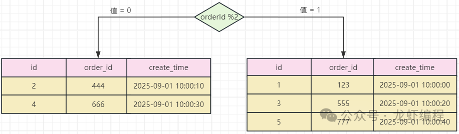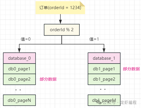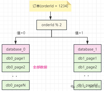 假设现在采用通过订单id取模的策略将订单数据分布到两个不同的库(database_0与database_1)上,如下图所示: