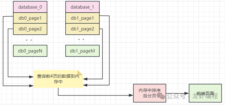 通过上述的分析得出分库分表下,我们要分页查询的数据由于不清楚到底是上述的哪种情况,所以在查询第2页数据的时候,我们必须要每个库都返回2页数据,这样得到的4页数据,然后在服务层进行内存排序,得到数据全局视野,再取第2页数据,便能够得到想要的全局分页数据,原理如下所示: