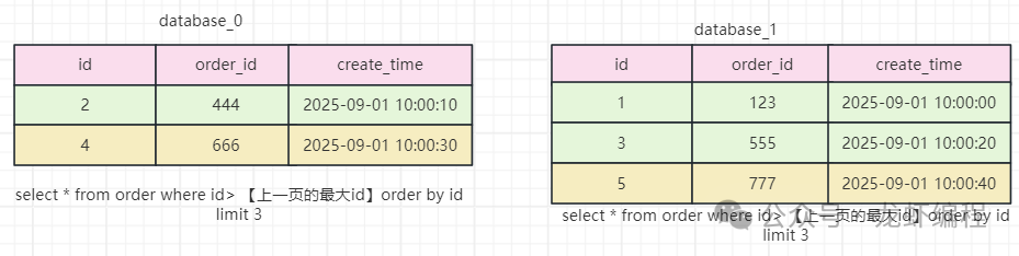 这个时候id=4和id=5的数据分布在不同的库上,此时如果每一个库上都通过select * from order order by create_time asc limit 3,3 分页查询的话就得不到数据了,那么就出现了分库分表下的分页查询问题。