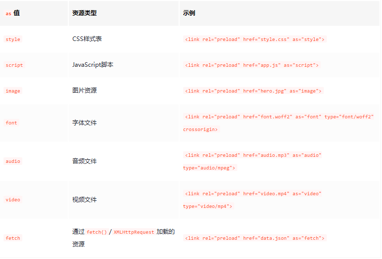 • href:必填,指定预加载资源的URL(支持相对路径和绝对路径)。